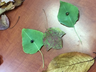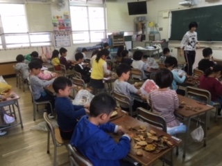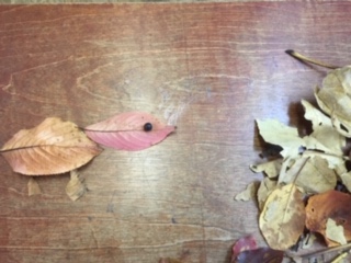 →昨日出かけた公園で集めた葉を使って動物など、いろいろなものを作りました。子どもたちの創造力はすごいです。できあがりが楽しみです。