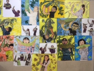 →ヘチマを持っているポーズを写真に撮り、その姿を描きました。よく見て描けています。