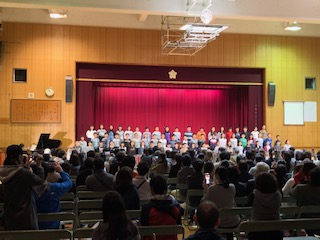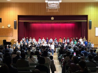 →5年生の演奏は、迫力のあるボディパーカッションからスタートし、美しい歌声を響かせた「つばさをだいて」、きれいなリコーダーの音色の「カントリーロード」、心を合わせた見事な演奏を披露してくれた「パプリカ」、みんな気持ちのこもった美しいハーモニーの「心のノート」でした。素晴らしい演奏と歌であっという間の20分でした。