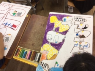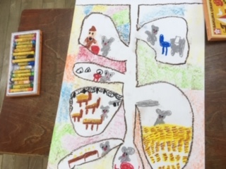 →おむすびころりんを参考にして、おむすびが地中に転がり、地中でのネズミの世界を想像してパスで描きました。
