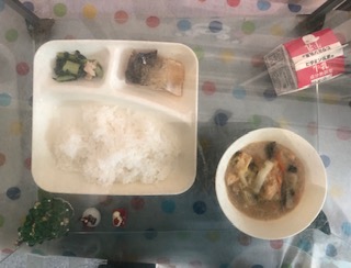 さばのみぞれかけ、みそ汁、こまつなの煮びたし、ご飯、牛乳