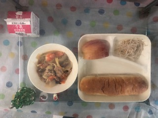 八宝菜(個別対応「うずら卵」)、もやしのごま酢あえ、りんご、パン、牛乳