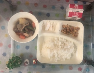 鶏肉と野菜の煮もの、じゃこ豆、かぶのゆず風味、ご飯、牛乳
