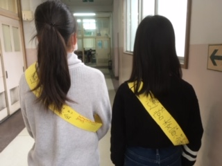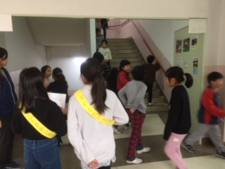 →児童会運営委員がたすきをかけて右側通行を呼びかけています。自分たちで学校生活を気持ちよく過ごせるように考えて取り組んでいる姿に感心します。効果があらわれてきています。