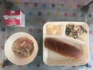 マカロニグラタン、だいこんのスープ、和なし、パン、牛乳