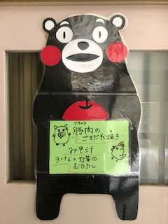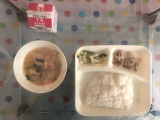 豚肉のごまだれ焼き、みそ汁、きくなとはくさいのおひたし、ご飯、牛乳