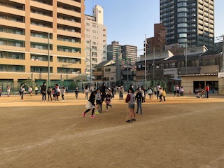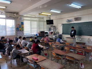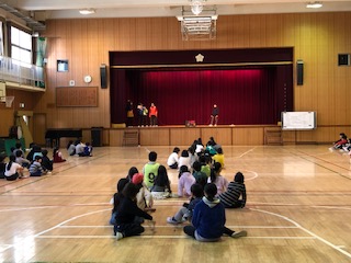 →運動委員会と集会委員会による集会活動が行われていました。運動場と体育館では「大なわ集会」、各教室では「リスニングゲーム」でした。