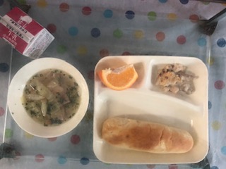 押麦のグラタン、スープ、いよかん、パン、牛乳