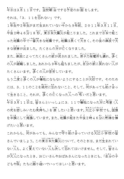 今から9年前、東日本大震災がありました。今日は『誰かのために、今の自分に何ができるかを考え、行動する、日』にしたいと思います。