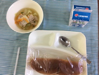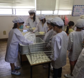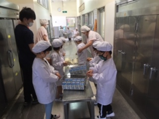 ・1年生も給食当番をがんばっています。給食室へ食器、牛乳、パン、おかずを取りに行き、教室へ運びました。教室ではできるだけ自分たちで配膳できるようにがんばりました。