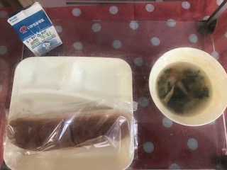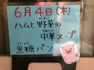 ハムと野菜の中華スープ、黒糖パン、牛乳