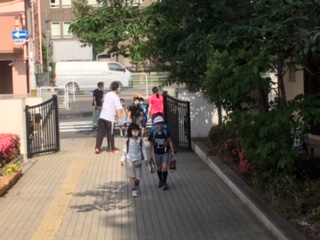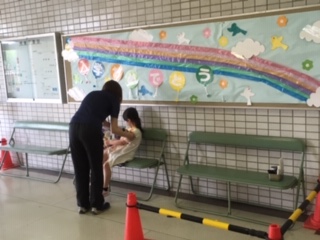 ・登校時には、正門前で検温の確認を口頭で行っています。また、検温を忘れた児童は、玄関ホールで検温をしてから教室に行きます。マスク忘れは、保護者に連絡して持って来てもらっています。