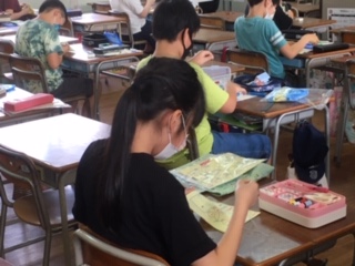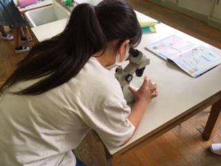 ・5年生は、顕微鏡の使い方を学び、メダカの卵を見ました。黒い目が見えて、驚いていました。また、家庭科では、裁縫練習布を使って縫い方を学びました。しっかりと練習した成果を小物作りに生かしたいです。