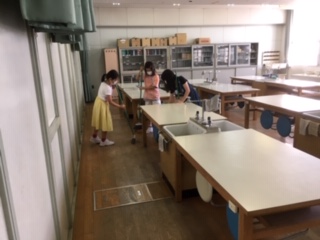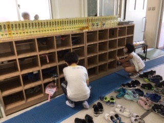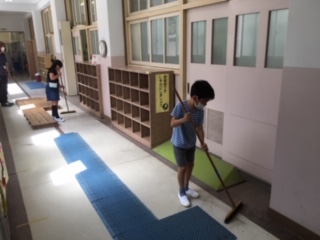 ・子どもたちは清掃活動に頑張っています。清掃活動は換気をして、マスクを着用して行なっています。感染防止のため、トイレは掃き掃除だけにしています。清掃後は石けんで手洗いします。