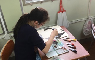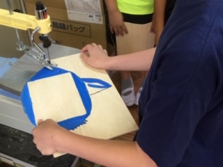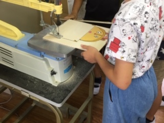 ・5年生の図工では、伝言板を使っています。板に絵を描き、伝言板を電動のこぎりで、形に合わせて切ります。できあがりが楽しみです。