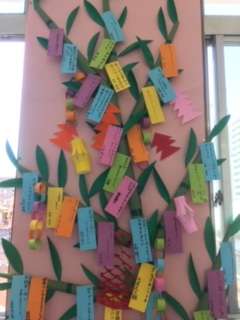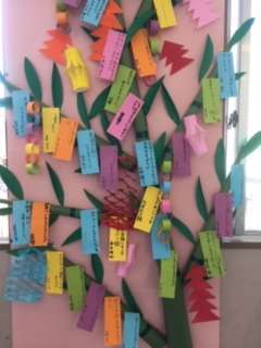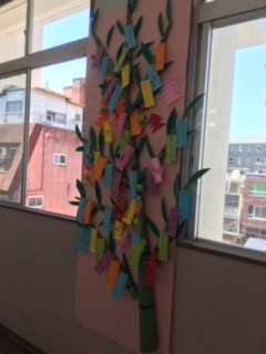 ・5年生の廊下には七夕飾りがあります。担任が手作りした笹に、子どもたちが自分の願いを短冊に書いてつけました。今年は、新型コロナウイルスに関する短冊がありました。『早くコロナがおさまってほしい』『いつもの生活に早く戻りたい』など。また、『クラスが、いつまでも笑顔あふれていますように』『星のように輝ける自分になりたい』など。子どもたちの純粋な気持ちに心が和みます。
