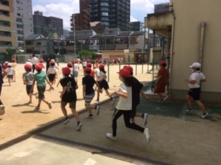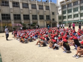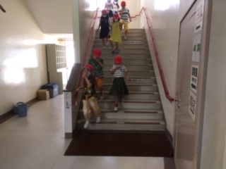 給食室から出火し、北階段が使用不可という設定で避難訓練をしました。1年生は初めての避難訓練でしたが、ハンカチを口に当て静かに移動できました。おさない、はしらない、しゃべらない、もどらないの『おはしも』の約束を守って避難ができました。訓練をきちんとすることが、自分の命、友だちの命を守ることになると、子どもたちは理解できました。