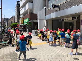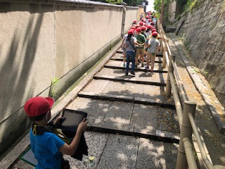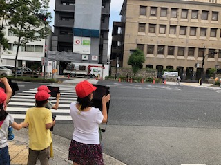・3年生が、校区をたんけんしました。大江の町の様子をメモしたり、タブレットで写真を撮ったりして調べました。