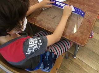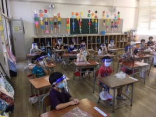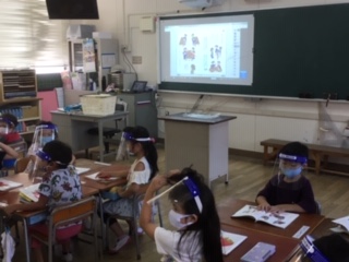・1年生が、フェイスシールドを使いました。先生から使い方や消毒の仕方を教えてもらい、国語のグループ学習で使いました。