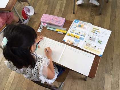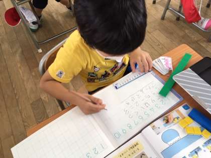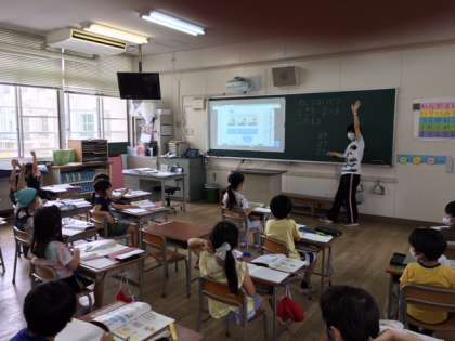 1年生の算数の授業です。先生からみんなにとっても難しい質問。「答えは3ひきですか?3ぴきですか?3びきですか?」きちんと単位の答え方についても確認です。ものさしを使って、ノートに線をひいています。上手に線をひくのも難しい!頑張れ!1年生。