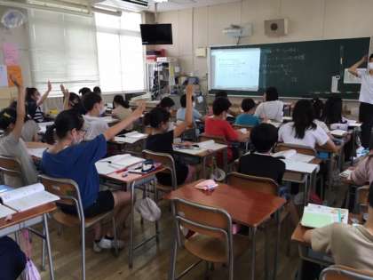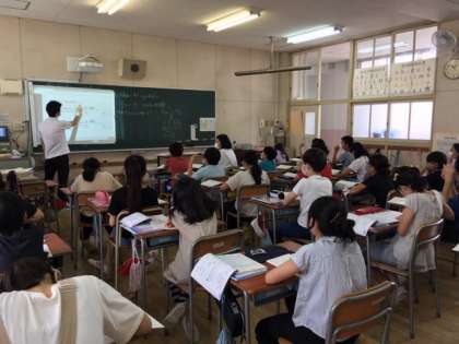 6年生、算数の授業です。高学年らしい静かな授業です。先生がゆっくりとした口調で授業を進めます。ときより、フッと先生が話題を変えて、子どもたちから笑いがおきます。「先生、わかりません!」「ちょっと待ってね」先生はやさしく個別で指導します。とても穏やかな教室です。