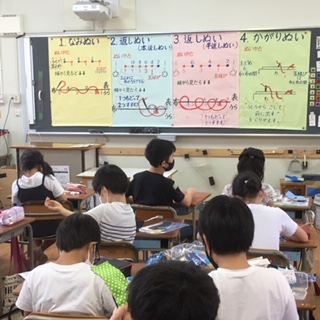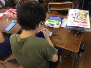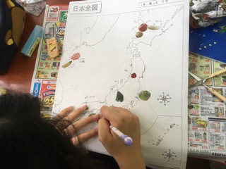 ・5年生では、家庭科と社会科で教科担任制をしています。今日は、社会科は産地調べをしました。スーパーのチラシを使って、魚や野菜などを切り、地図に貼りました。
