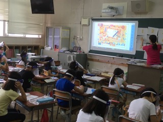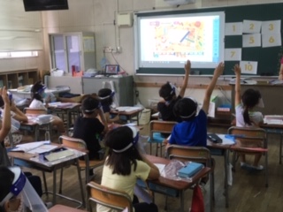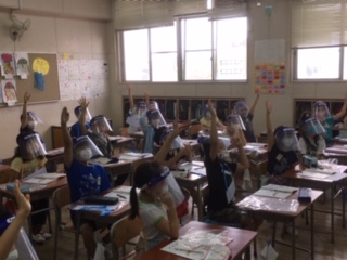 ・週1時間の外国語活動をしました。フェイスシールドをして、活動しました。1から10までの数字を英語を言う学習ですが、先生が1から10の数字を貼り、児童が目を閉じて、先生が抜いた数字を英語で答えるゲームをして楽しく学習しました。