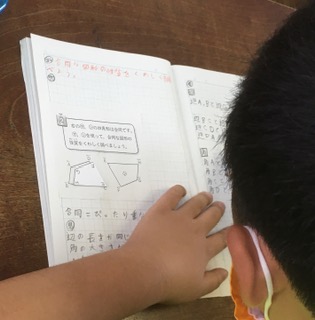 ・5年生が算数『合同な図形』を学習しています。7月第1週の教材です。合同な図形の性質を調べ、合同な図形は、対応する辺、対応する角が同じであることを学びました。