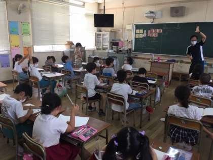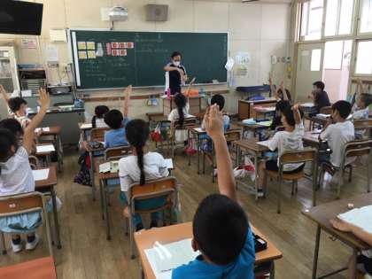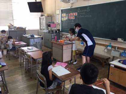 2年生・算数「水のかさ」。どちらの水筒の方がたくさん水が入るのか?ただの水筒と思いきや、「たけしさん」と「えりかさん」の水筒のなかには、本当に水が入っていた!子どもたちの食いつきが違います。低学年の子どもたちには難しい量感の問題ですが、実際に具体物を使って考えることで子どもたちの理解が全く変わってきます。
