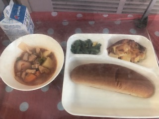 ケチャップ煮、さんどまめとコーンのソテー、りんごのクラフティ、パン、牛乳