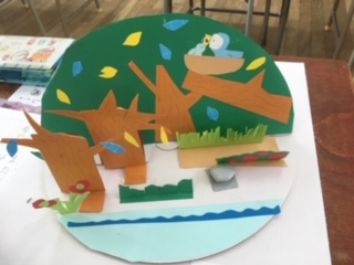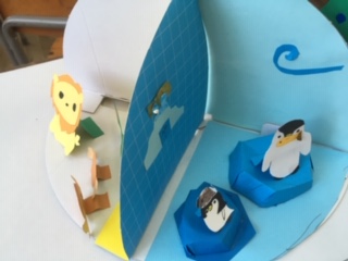 ・3年生が、『ジャンプ』動物ランドのテーマで立体工作を作りました。今日は自分の作品のいいところ見つけを書きました。その後、鑑賞会をしました。友だちの作品のいいところをたくさん見つけて書きました。