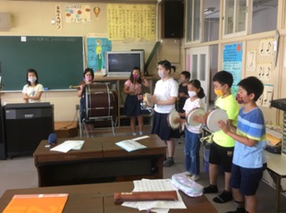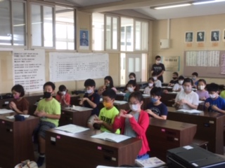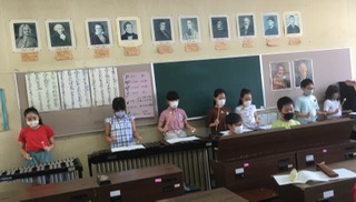・5年ろ組が1学期で学んだ『ハナミズキ』をリコーダー伴奏と手話で歌いました。手話が上手でした。合奏は『リボンのおどりを演奏しました。皆が心をひとつにして演奏できました。