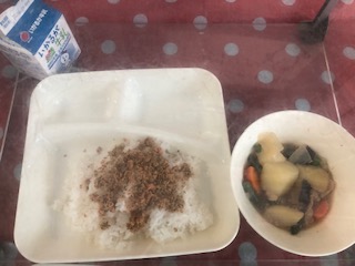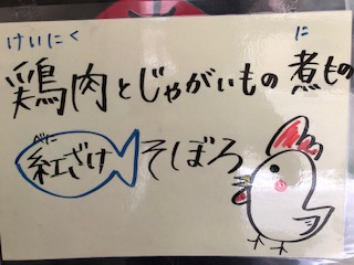 鶏肉とじゃがいもの煮もの、紅ざけそぼろ、ごはん、牛乳