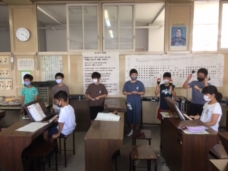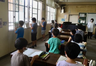 ・4年い組が、リコーダーで3曲、合奏は『いろんな木の実』を演奏しました。リコーダーのきれいな音色が音楽室に響きました。合奏はギロなどを使って、南国の雰囲気を醸し出す演奏でした。
