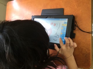 ・2年生がタブレット端末を使って学習しました。撮影した写真を保存し、名前を書きました。お絵かきもしました。タブレット端末の使い方に慣れてきました。