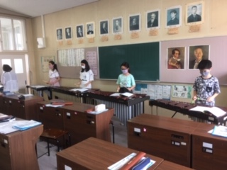・1学期の音楽のまとめとして担任の先生を招待してミニ演奏会をしました。リコーダーで『メヌエット』、合奏は『ラバーズコンチェルト』を演奏しました。担任からは、5年生の時より力強さが出た演奏ですばらしいと、ほめてもらいました。