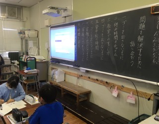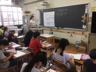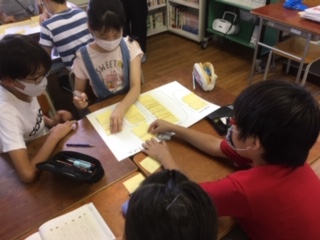 5年い組は国語『問題を解決するために話し合おう』をしました。ろ組は算数『整数の性質を調べよう』をしました。い組はグループで付箋を使って話し合った内容をまとめました。ろ組は公倍数や最小公倍数の学習をしました。