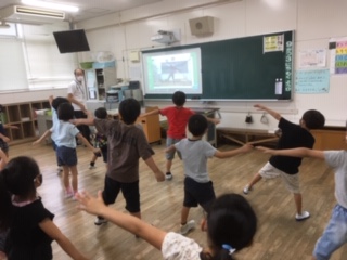 1年生は教室で、ビデオを見ながらダンスの振り付けを覚えました。