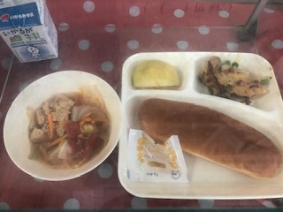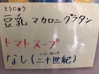 豆乳マカロニグラタン、トマトスープ、なし(二十世紀)、マーマレード、パン、牛乳