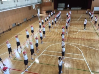 6年生が講堂で運動会でするダンスの練習をしました。本年度の運動会は組体操ができません。ダンスなど一人で演技をする内容を考えています。2年生は、各クラスでダンスの振り付けを覚えました。熱中症を考え、クーラーのある教室で覚え、ある程度覚えてから学年練習を講堂や運動場で行います。