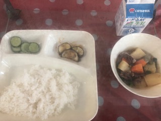 肉じゃが、焼きなすのみそだれかけ、あっさりきゅうり、ごはん、牛乳