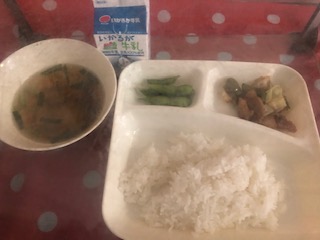 ホイコウロー、中華スープ、えだまめ、ごはん、牛乳