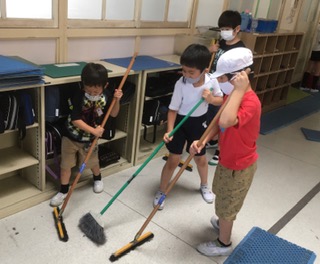 ・毎週火曜日は、たてわり班で掃除をしています。高学年が低学年に掃除の仕方を教えて、皆で協力して行っています。