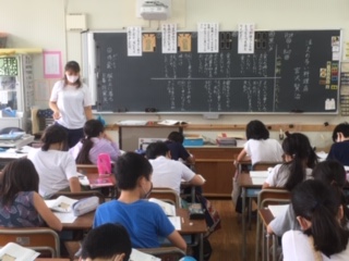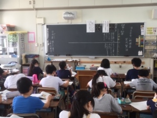 ・5年生は、国語『注文の多い料理店』を学習しています。扉に書かれているメッセージを山猫軒側と二人の紳士側がどのように考えているかを、ワークシートに記入していきました。たくさんの児童が自分の考えを発表していました。