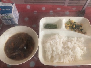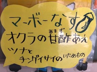 マーボーなす、オクラの甘酢あえ、ツナとチンゲンサイのいためもの、ごはん、牛乳