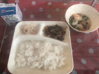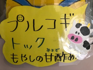 プルコギ、トック、もやしの甘酢あえ、ごはん、牛乳