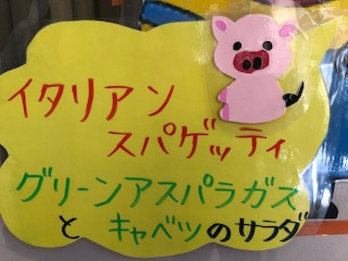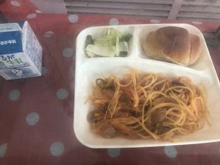イタリアンスパゲッティ、グリーンアスパラガスとキャベツのサラダ、パン、牛乳
