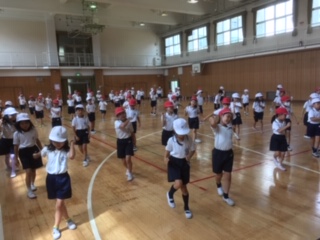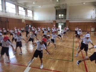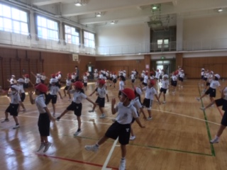 ・2年生が講堂で団体演技の練習をしました。入場から退場まで通して、練習しました。給食時間には、撮影したビデオを見ました。