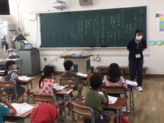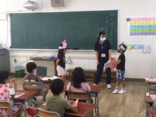 ・1年生の教育実習生が、道徳の授業をしました。題材は『はしのうえのおおかみ』主題は『親切はいい気持ち』です。登場する動物になりきって、気持ちを考えました。