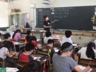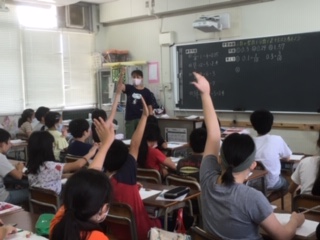 ・5年生が算数で、小数や整数を分数で表す方法を考える学習をしました。既習事項を使って考えることができました。